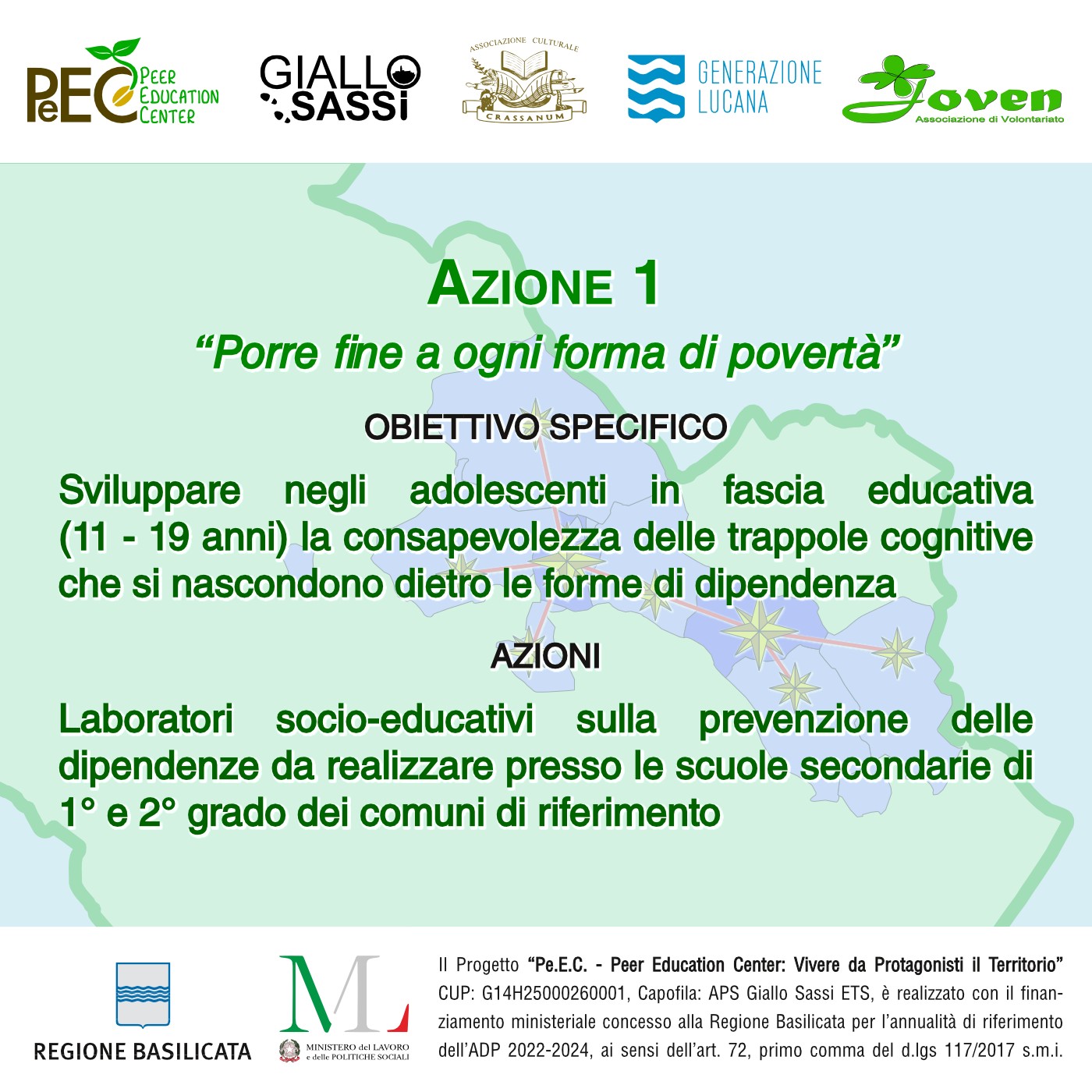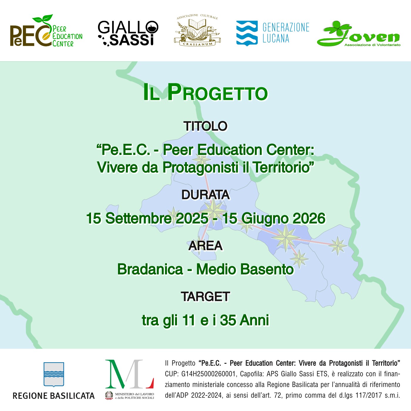 Descrizione Il documento è il Patto di Comunità relativo al progetto "Peer Education Center: Vivere da Protagonisti il Territorio" (Pe.E.C.) , promosso da APS Giallo Sassi ETS come Capofila. Allegati 2025.10.30 - Protocollo Progetto PeeC - AST + Comuni Bradanica Medio Basento + Scuole - Bando ETS Basilicata 2025 - APS Giallo Sassi ETS-1 pdf - 2,02 MB 01 - Mappa Comuni Progetto PeEC - B3S-Basilicata-1 jpg - 351,2 KB 02 - Dati Progetto PeEC - B3S-Basilicata jpg - 265 KB 03 - Azione 1.1 Progetto PeEC - B3S-Basilicata jpg - 372,3 KB 04 - Azione 1.2 Progetto PeEC - B3S-Basilicata jpg - 355,1 KB 05 - Azione 2.A Progetto PeEC - B3S-Basilicata jpg - 362,1 KB 06 - Azioni 2.C e 2.D Progetto PeEC - B3S-Basilicata jpg - 278,8 KB 07 - Firma Patto Comunità Progetto PeEC - B3S-Basilicata jpg - 379,8 KB Ulteriori informazioni